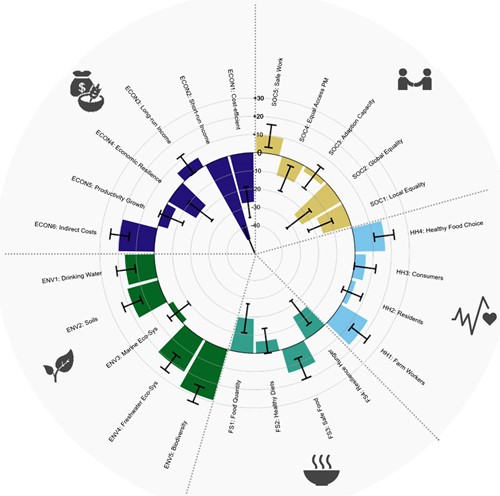 Im Durchschnitt erwarten die Befragten in den Bereichen Umwelt (grün) und Gesundheit (blau) positive Auswirkungen einer Umstellung. In anderen Bereichen zeigen sich kurzfristig Zielkonflikte. Langfristig werden auch beim Einkommen (long-run income, violett), bei der Sicherheit der Lebensmittel (safe food, blaugrün) oder der Arbeitssicherheit (safe work, gelb) die Veränderungen positiv eingeschätzt. Die Erwartungen fallen aber etwa in Europa und Nordamerika weniger positiv aus und in Regionen mit geringeren Einkommen höher. (Abbildung: AG Möhring/Uni Bonn)